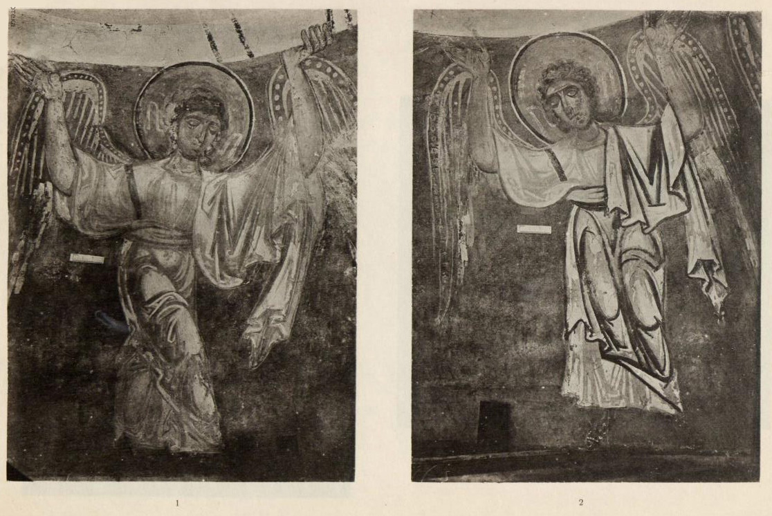 Прежде всего, это — обилие изображений ангелов. Кроме Михаила и Гавриила, написанных по обычаю на восточном своде, мы видим в каждом люнете, северном, южном и западном, вместо отдельных сложных композиций, по колоссальной поясной фигуре архангелов — Рафаила, Уриила и Селафиила. Мало того, в люнете восточной стены жертвенника помещена фигура херувима, а в нижнем поясе диаконика — изображение шестикрылого серафима в медальоне. Подобное обилие ангелов, необычное в других памятниках, мне известно только в некоторых росписях М. Азии, где оно может быть объяснено местным высоким почитанием сил небесных, особенно же архистратига Михаила.