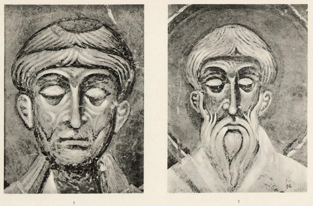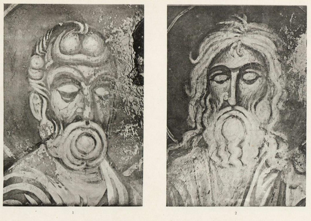 Наконец, остается отметить еще два пошиба. Один из них отличается очень странной не византийской драпировкой складок и плоскими, почти сплошь забеленными лицами и напоминает некоторые романские фрески Бриксена, а особенно те фрески, которые были недавно открыты в церкви S. Croce di Gerusalemme в Риме. Другой пошиб, очень грубый и неискусный, имеет большие точки соприкосновения с росписью капеллы Quattro Coronati в том же Риме.