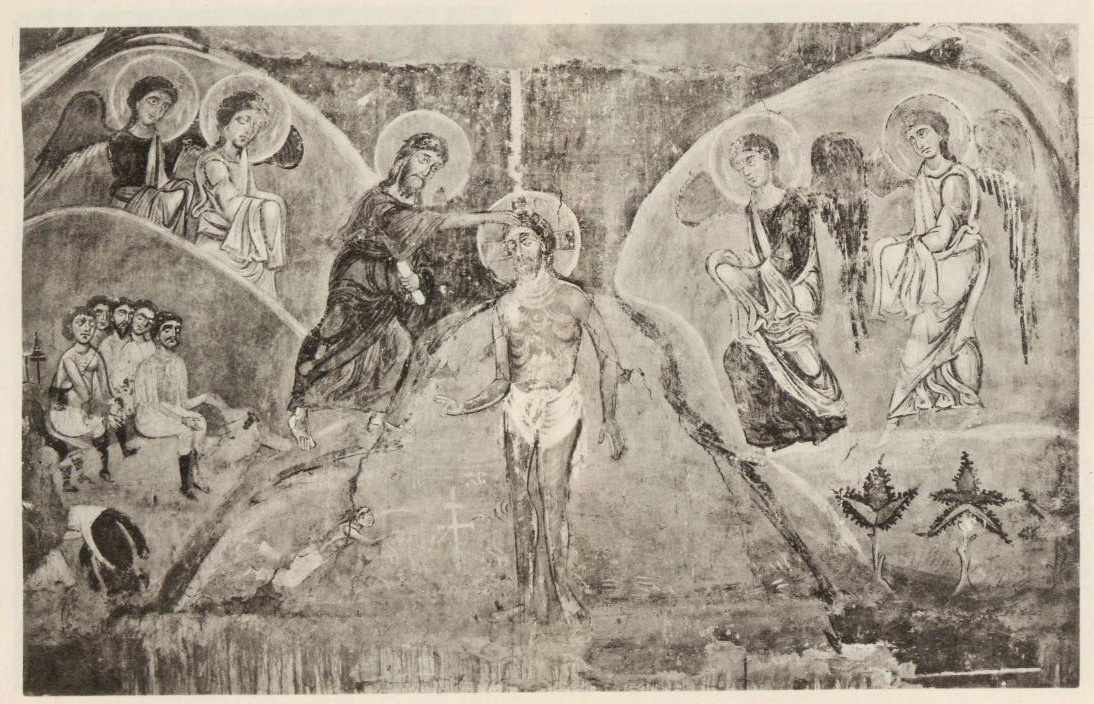 Мне кажется возможным истолковать это изображение легендой об иерействе Христа, известной уже в VIII веке и впервые подробно изложенной у Свиды. По словам этой легенды, Иисус был выбран в число 22 священников Иерусалимского храма за мудрость, чистоту и добродетели и несмотря на то, что был еще очень молод. Ведь и на фреске он представлен именно молодым.