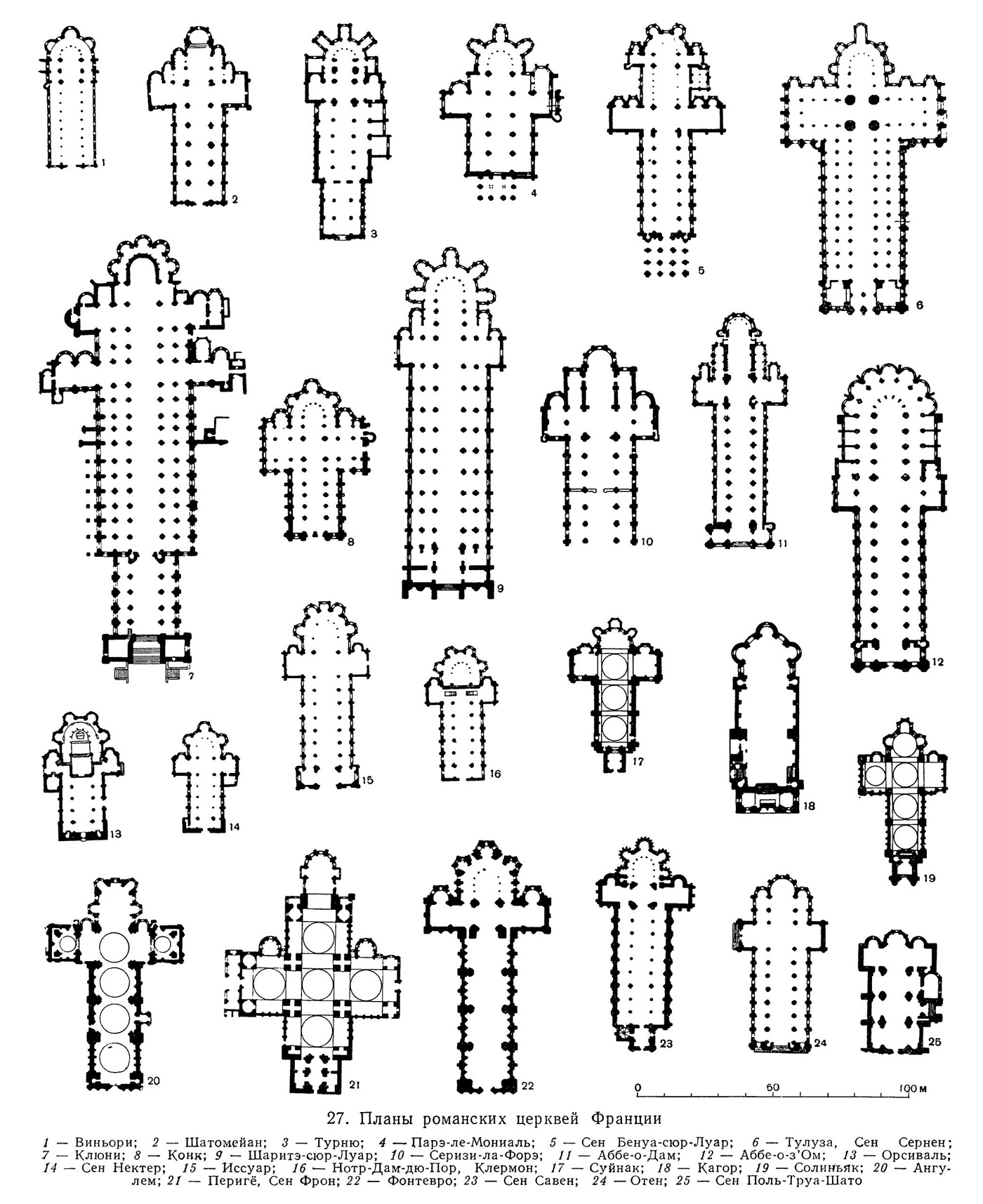 27. Планы романских церквей Франции: 1 — Виньори; 2 — Шатомейан; 3 — Турню; 4 —Царэ-ле-Мониаль; 5 — Сен Бенуа-сюр-Луар; 6 — Тулуза, Сен Сернен; 7 — Клюни; 8 — Конк; 9 — Шаритэ-сюр-Луар; 10 — Серизи-ла-Форэ; 11 — Аббе-о-Дам; 12 — Аббе-о-з’Ом; 13 — Орсиваль; 14 — Сен Нектер; 15 — Иссуар; 16 — Нотр-Дам-дю-Пор, Клермон; 17 — Суйнак; 18 — Кагор; 19 — Солиньяк; 20 — Ангулем; 21 — Перигё, Сен Фрон; 22 — Фонтевро; 23 — Сен Савен; 24 — Отен; 25 — Сен Поль-Труа-Шато