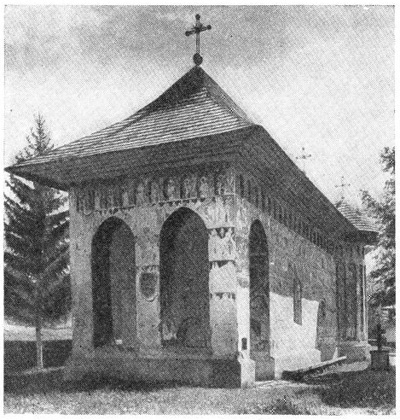 В монастыре Молдовица (1532 г.) — одном из самых совершенных творений молдавской архитектуры — мастера, продолжая опыт Хумора, создали здание, имеющее еще более величественный вид (рис. 22). Здесь неф церкви более высок и увенчан изящной башней, а притвор, предшествующий входу, просторнее и имеет более приветливый вид. Столбы арок тоньше, чем стены помещения, число арок на главном фасаде увеличено до трех, а проемы, оставленные для входов, заполнены в нижней части дополнительными арками, близкими по высоте к человеческому росту.
